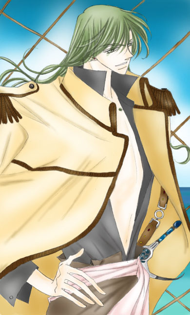 2005.3.14皆さんの温かいお心のお陰で、ホワイトデー企画コミックとして 念願の友様海賊編を描く事が出来ました。 その時の御申し込みに描かせて頂いた友様です☆ 友様のはおっている上着の色を初めに使いたいと思い、ではどんな上着がいいか を考え・・・・・形になって行きました。 海の色を暗くなく「マリンブルー」の明るい色に出したいと塗りました。 ・・・自分でもなかなか私にしては上手く行った・・・と思うイラストの一枚です。